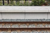 Speciale structuurwanden vangen het hoogteverschil op bij station Chèvremont in Kerkrade. De structuur op de wanden is een ontwerp op basis van de spoorlayout van emplacement.