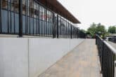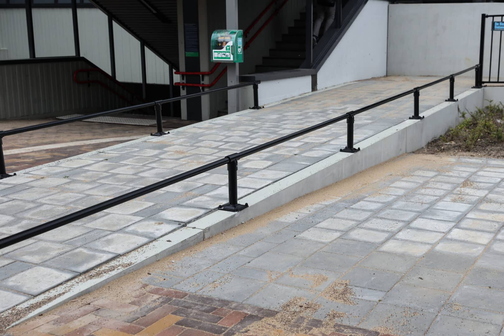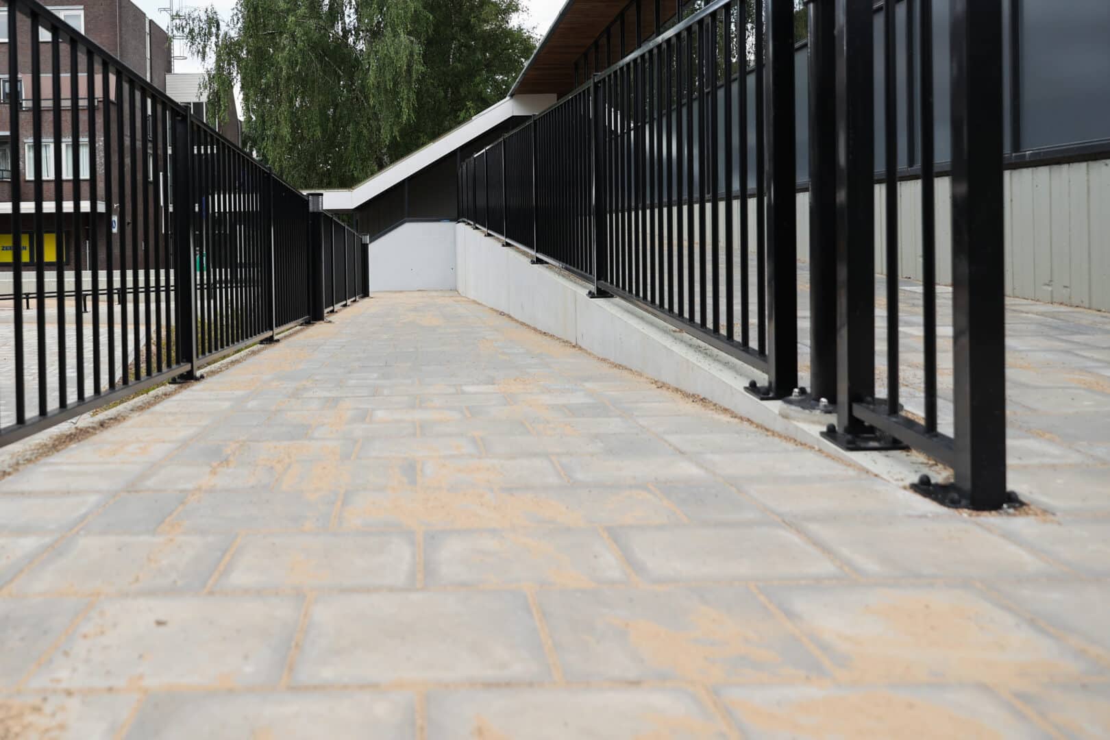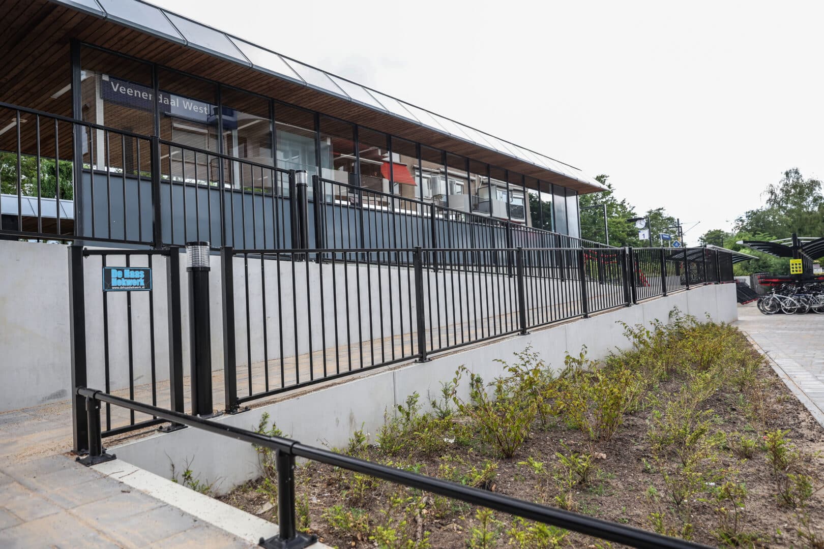 Voor de renovatie van station Veenendaal-West werd het plan breder getrokken dan alleen de renovatie en verlenging van de perrons. Zo werd er een nieuwe hellingbaan gerealiseerd om zonder traptreden het station te kunnen betreden. Voor de bouw van de hellingbaan werden hoogtes aan wanden uit het LR-keerwanden assortiment van Bosch Beton gebruikt. De LR-keerwanden zijn speciaal ontwikkeld voor de zwaarste belastingtoepassingen in de GWW. Om de hellingbaan naadloos op elkaar te laten aansluiten, werden de keerwanden, variërend in een standaardhoogte van 50 tot 175 cm is de fabriek afgeschuind, waardoor het eerste gedeelte gelijkvloers begint en in een vloeiende lijn op 175 cm hoogte eindigt. Daarnaast werden de keerwanden in de fabriek al aangepast met mantelbuizen, zodat de kabels voor de verlichting en het hekwerk gemonteerd konden worden. Door de nieuwe hellingbaan slim te ontwerpen zijn er geen ingrijpende hoogte aanpassingen nodig geweest en is er ruimte ontstaan om de hellingbaan, de fietsenstalling en de maaiveldinrichting van het voorplein volledig af te stemmen op de omgeving.